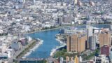 徳島市中心部の街並みとモダンな建築と広場